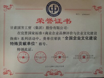 2012年度“全國企業(yè)文化建設(shè)特殊貢獻單位”榮譽證書