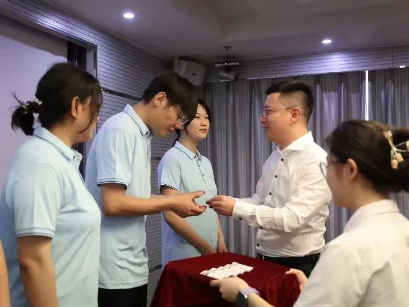 伴隨著激昂的音樂,入職儀式進(jìn)入了發(fā)放工牌的環(huán)節(jié)。國芳集團(tuán)各位領(lǐng)導(dǎo)面帶微笑,將蘊(yùn)含著公司信任與期望的工牌并伴手禮交到新員工手上,工牌在燈光的照耀下,折射出他們堅(jiān)定的信念和對新征程的信心。
