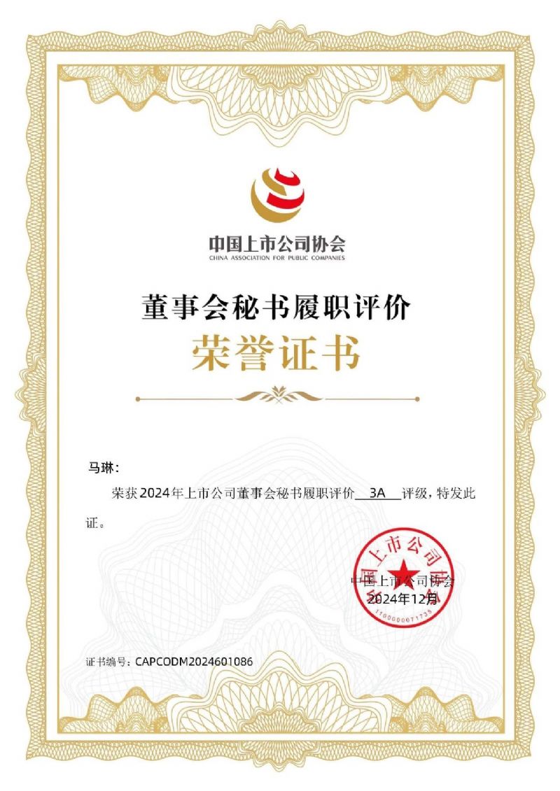 中上協(xié)發(fā)布丨公司榮獲“2024上市公司董事會(huì)秘書履職評(píng)價(jià)”3A評(píng)級(jí)